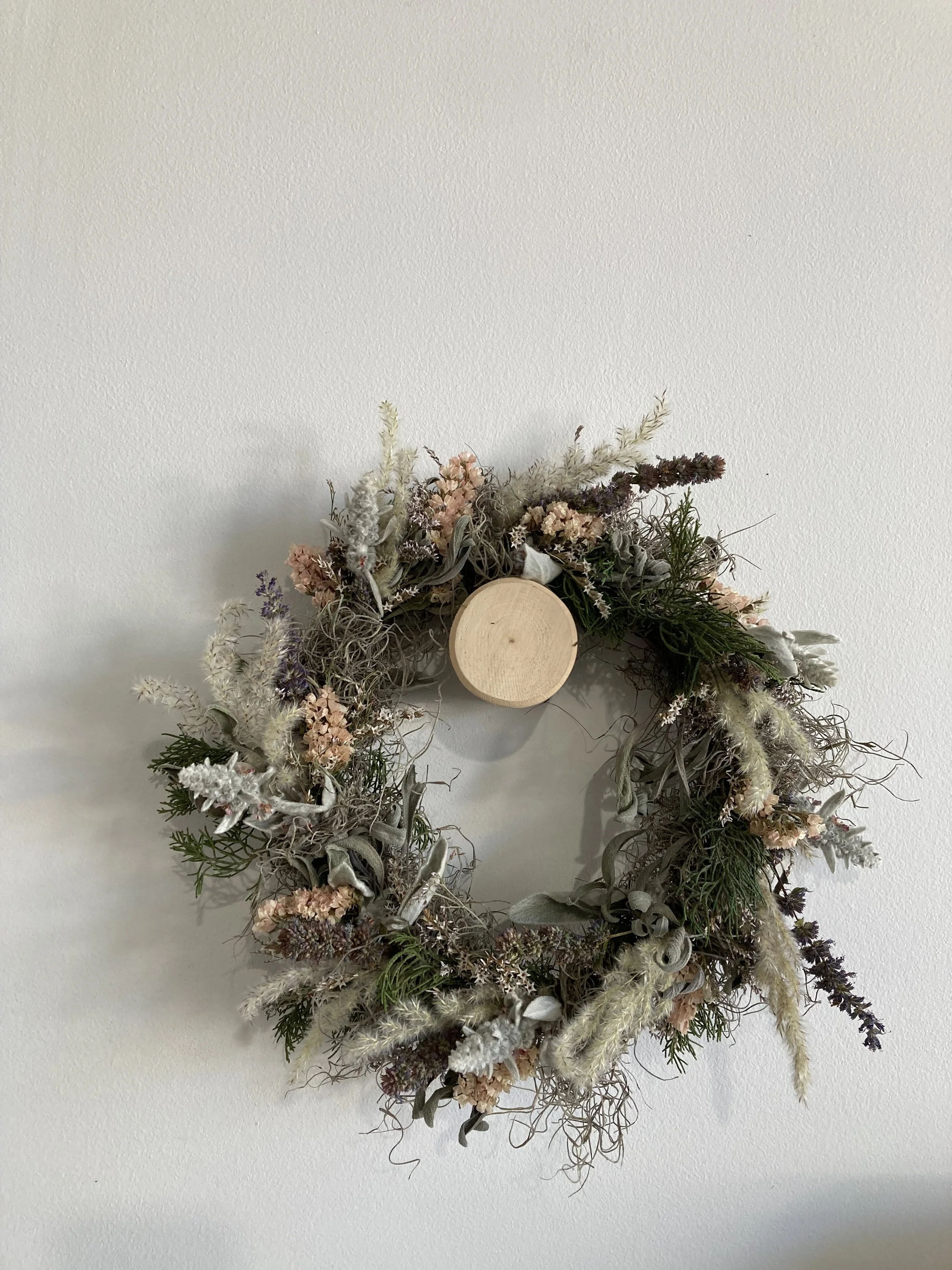 I offer 3 wreath workshops using a variety of dried and fresh flowers as well as seasonal greenery. Each class uses a premade 10” grapevine wreath to build a full or half wreath. Wreath classes take about an hour.
