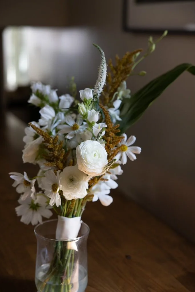 Zoey was looking for more sculptural arrangements for her wedding. We used a mix of ranunculus, cosmos and dendrobium orchids to create movement and texture, with gomphrena in the maid’s bouquets for a simple statement arrangement. Two large compotes flanked the altar and were repurposed at the reception entrance with some dripping amaranth to continue our sculptural theme.